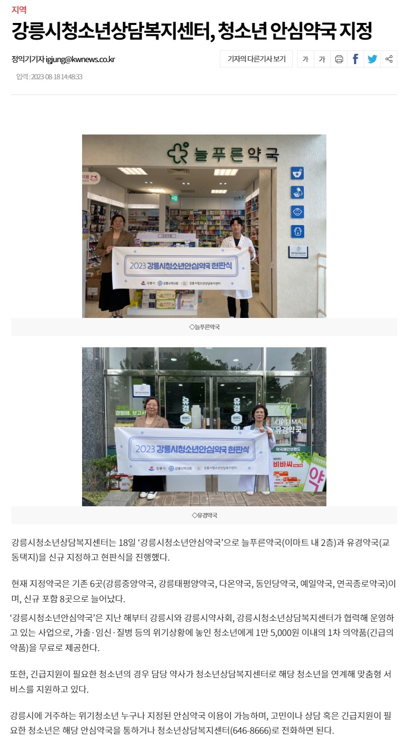 강릉시청소년상담복지센터, 청소년 안심약국 지정 - 강원일보 (kwnews.co.kr)